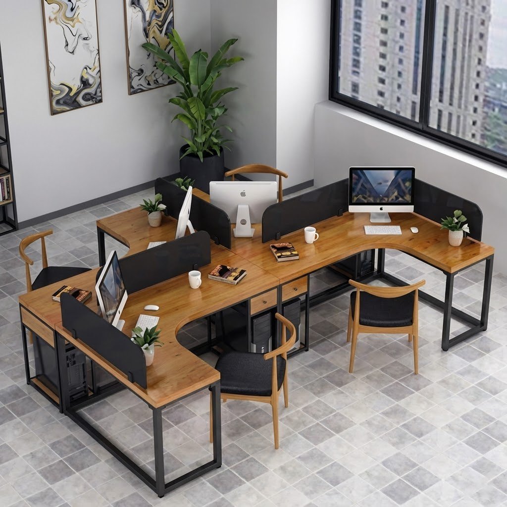 A stylish 4-seater office workstation featuring a natural wood finish, sturdy metal frame, and sleek privacy panels. Designed for collaborative yet focused workspaces, ideal for modern offices and co-working environments.