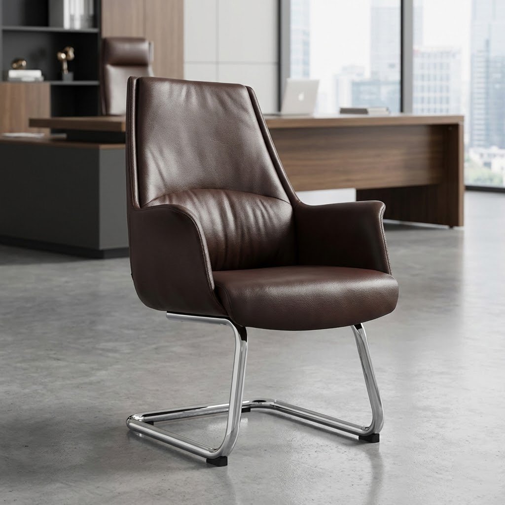 Elevate your workspace with this sophisticated visitor chair, designed to blend modern aesthetics with executive comfort. The chair features plush, dark brown leather upholstery with subtle stitching details, offering a soft yet supportive seating experience.