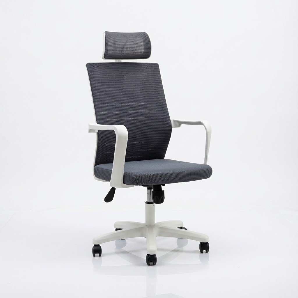 This contemporary chair distinguishes itself with a stylish white frame and base, contrasting elegantly with the dark grey mesh backrest. Equipped with an adjustable headrest and fixed white armrests, it offers a fresh, minimalist aesthetic for modern office interiors.