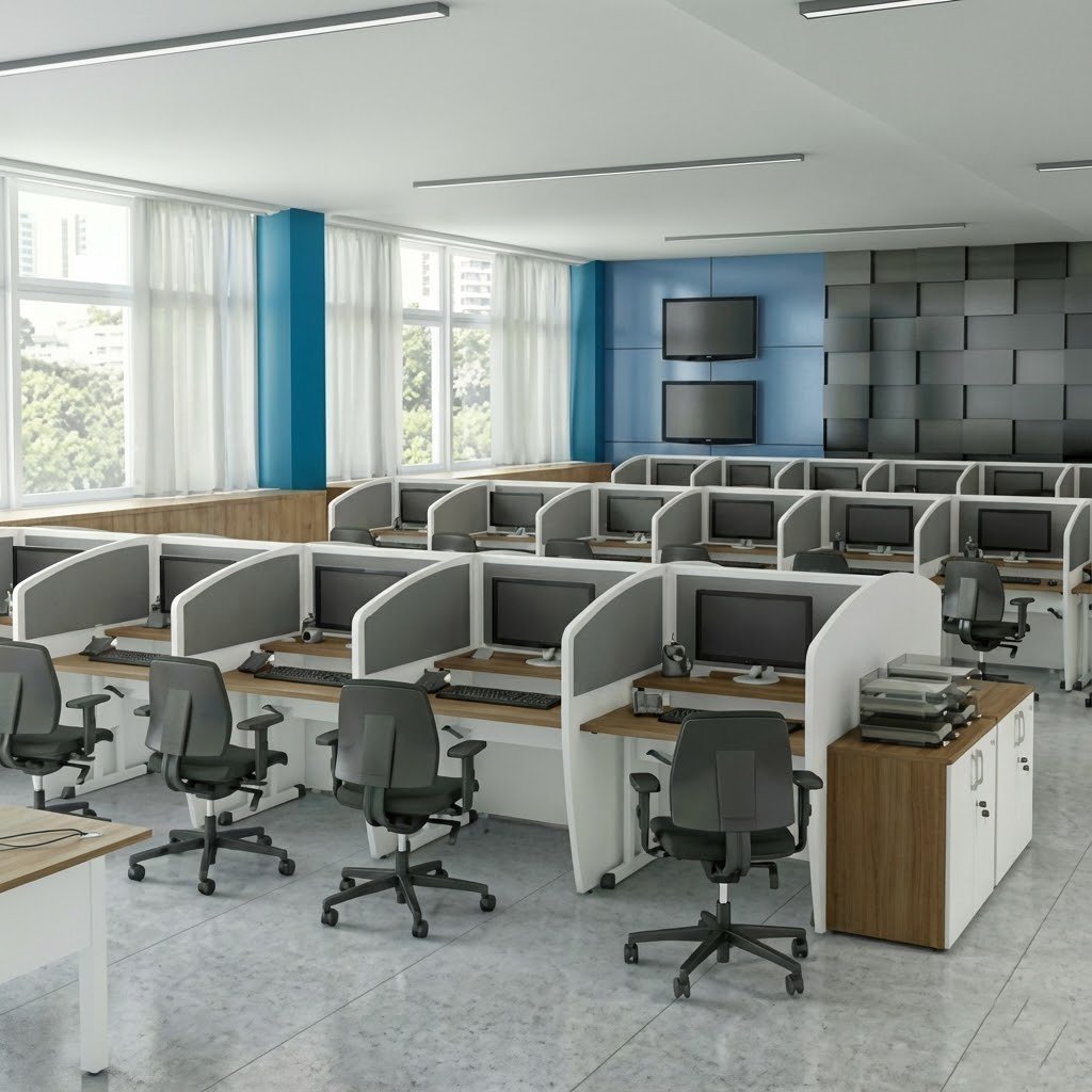 A modern open-plan office workstation system designed for large teams and high productivity. Featuring ergonomic desks, privacy divider panels, integrated storage, and comfortable seating, this setup promotes collaboration while maintaining individual focus ideal for corporate offices, call centers, and IT workspaces.